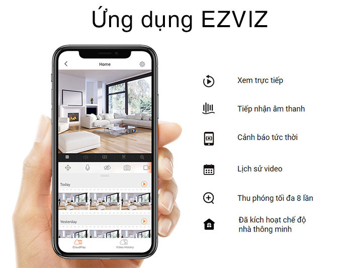 Dễ dàng điều khiển camera tại ứng dụng EZVIZ trên điện thoại, Bạn cũng có thể dễ dàng chia sẻ cho người thân cùng xem được camera trên ứng dụng.