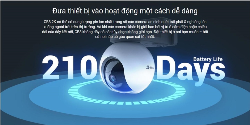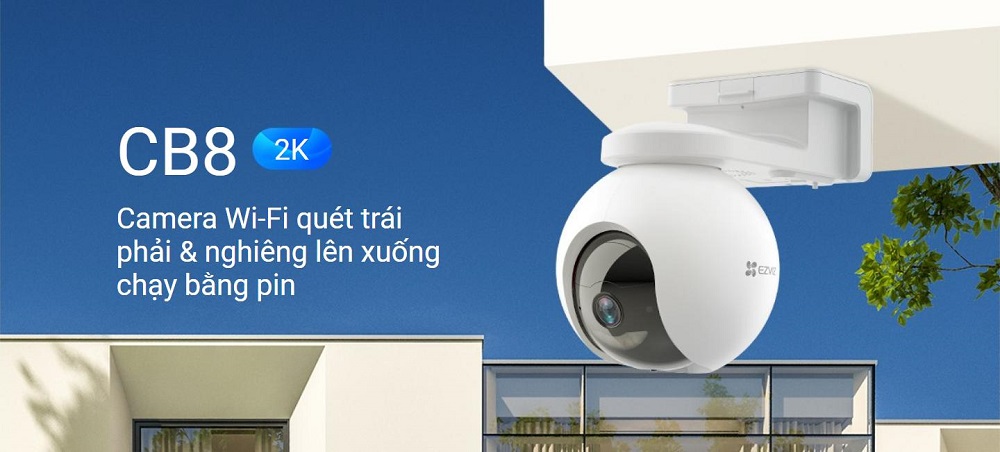 Camera WiFi thông minh EZVIZ CB8 2K chạy bằng pin là sản phẩm Camera Wi-Fi quay quét trái phải & nghiêng lên xuống chạy bằng pin mới nhất chính hãng. Camera CB8 2K là camera sử dụng cho gia đình dễ dàng, không cần dây 100% để đi bất cứ đâu, có động cơ để thu trong trường nhìn 360 độ và đủ thông minh để cung cấp khả năng bảo vệ ngôi nhà tự động. Các tính năng như phát hiện người, tự động theo dõi, nhìn ban đêm có màu làm cho CB8 2K mang lại hiệu suất hơn so với các camera khác. Camera này hoàn toàn loại bỏ việc lắp đặt phức tạp của một camera ngoài trời, bằng cách kết nối với bảng năng lượng mặt trời tùy chọn.