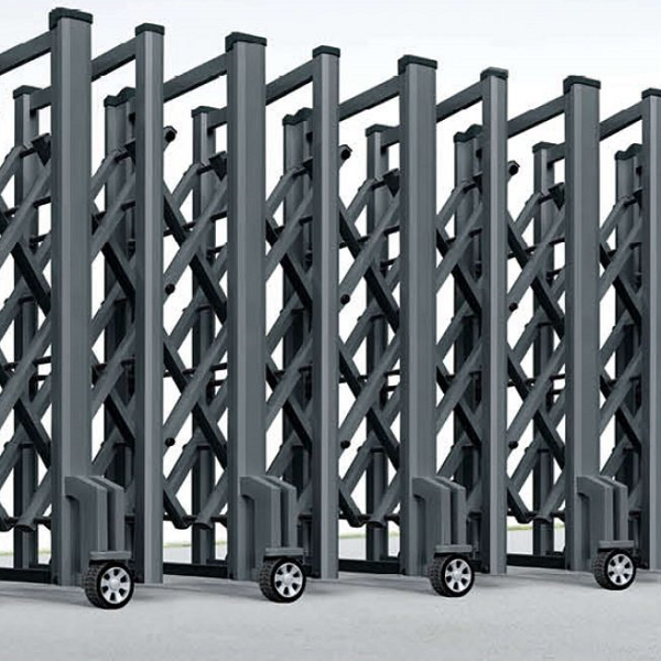 Cổng xếp hợp kim nhôm chạy điện Mil11 có phần đầu cổng và ốp bánh xe được đúc nguyên khối bền chắc. Hệ thống bánh xe được làm từ cao su có khả năng chịu mài mòn và giúp sản phẩm vận hành êm ái, hạn chế tiếng ồn trong lúc vận hành.