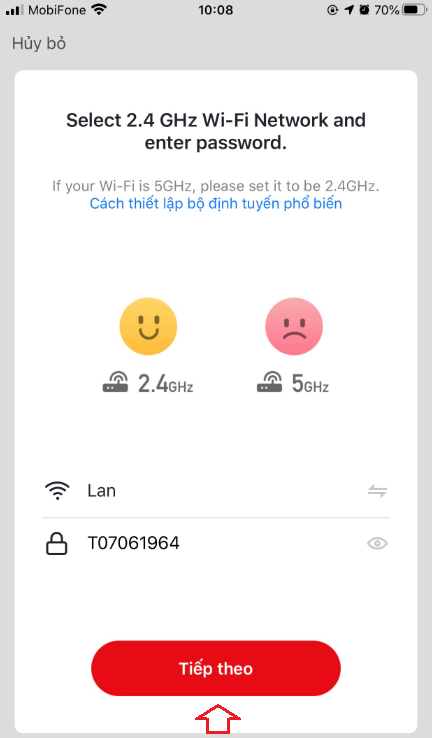 - Điền mật khẩu wifi, sau đó bấm " Tiếp Theo "