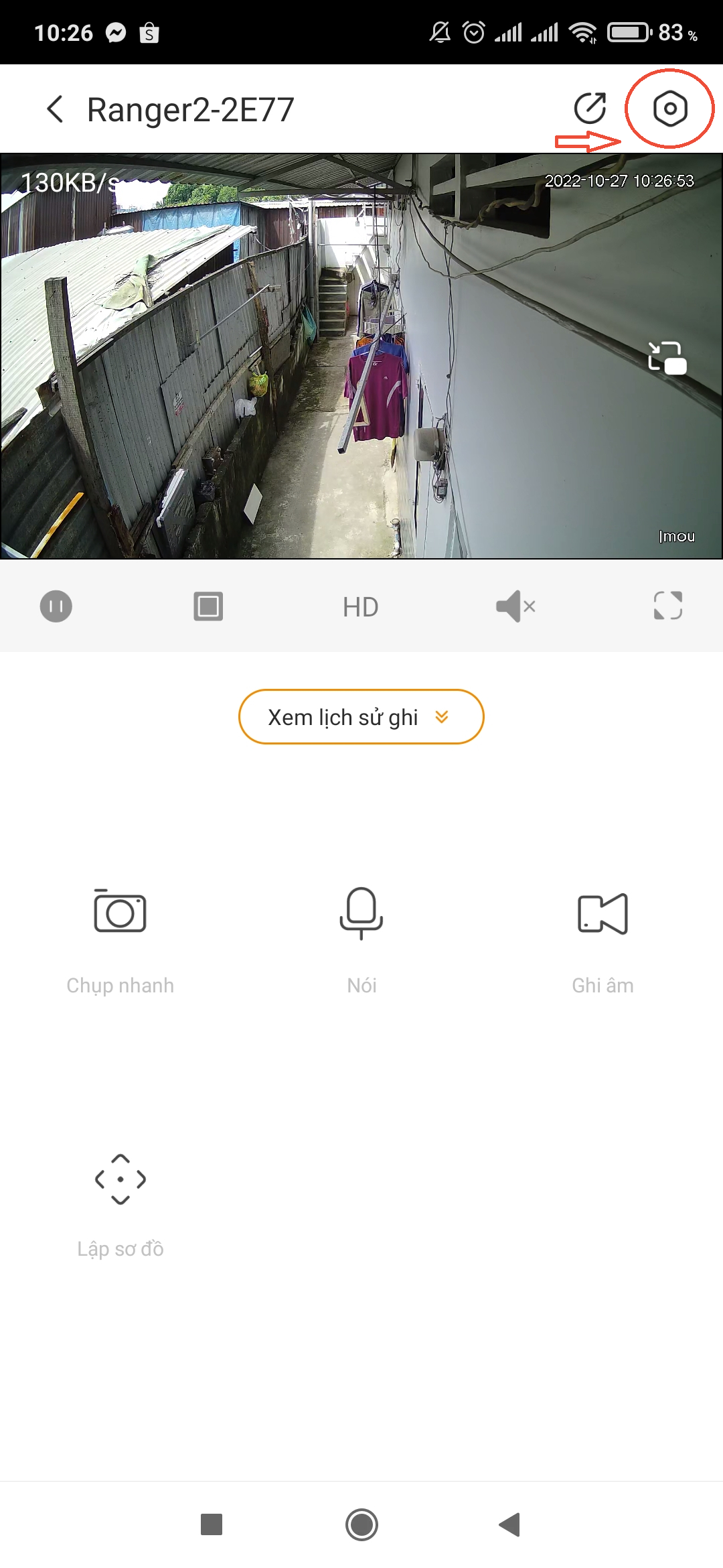 Bước 1: bạn mở phần mềm Imoulife và chọn thiết bị camera muốn xóa, bạn chon "Setting" có biểu tượng bánh răng phía trên bên phải màn hình: