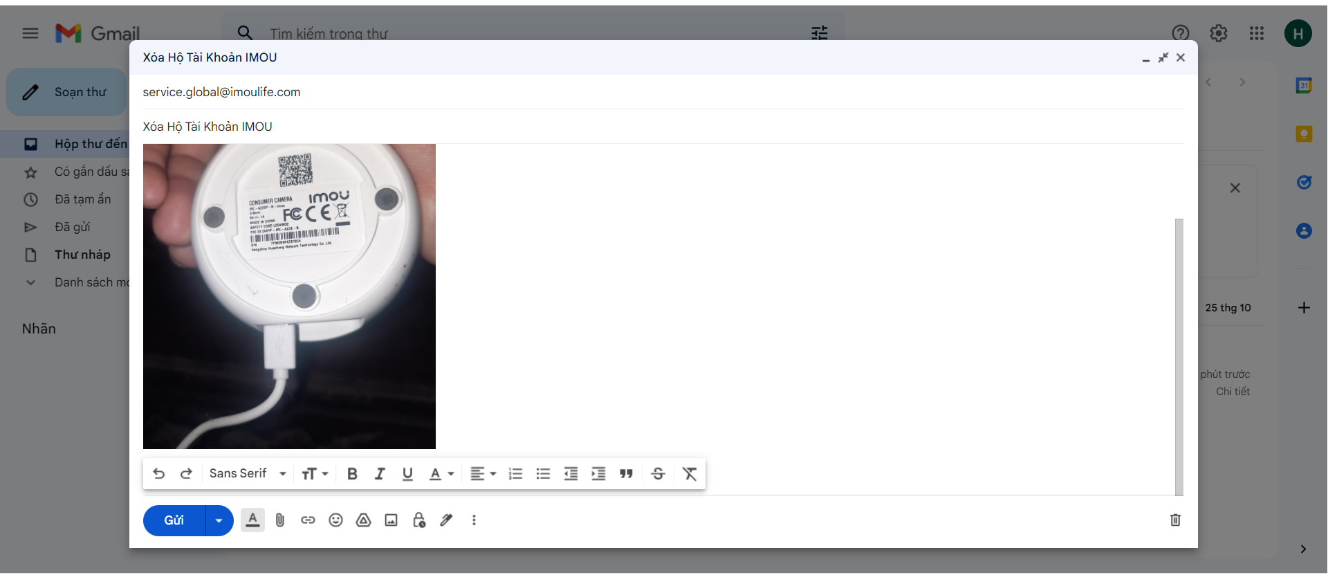 >>> Hướng dẫn gửi mail hỗ trợ xóa tài khoản camera imou bị gán vào tài khoản.