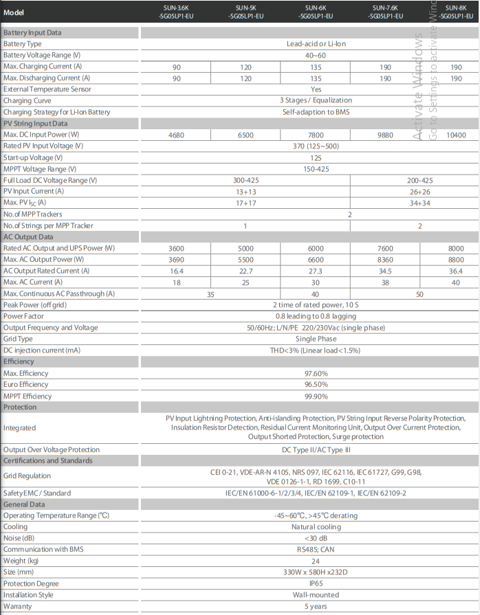 Thông số kỹ thuật Inverter Hybrid Deye 8kW SUN-8K-LP1-EU
