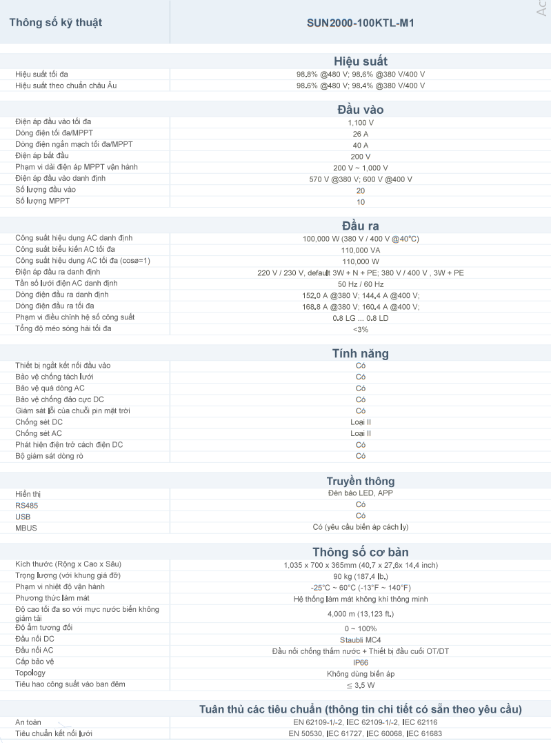 Thông số kỹ thuật Inverter Huawei SUN2000-100KTL-M1