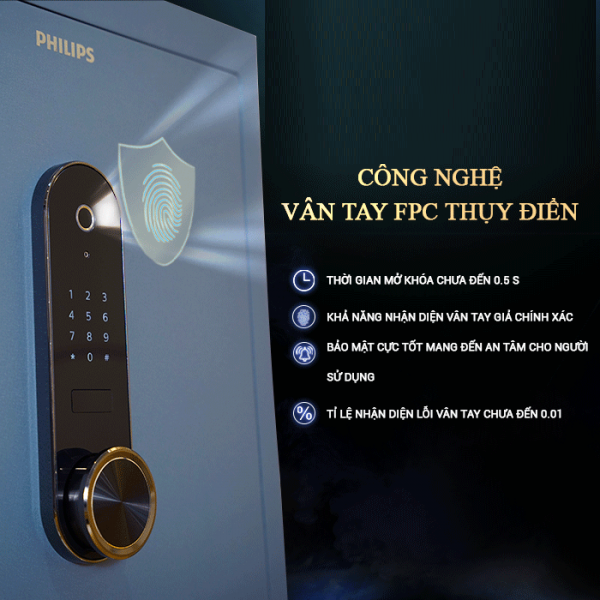 Két sắt điện tử Philips SBX601-6B0 ứng dụng công nghệ vân tay FPC Thụy Điển trứ danh của Philips. Công nghệ này sử dụng tới 3 cảm biến để nhận diện vân tay: cảm biến điện dung, cảm biến nhiệt độ, cảm biến áp suất. Điều đó giúp cho khả năng bảo mật cao hơn phương pháp nhận diện quang học thông thường. Nhờ vậy, công nghệ này hiện đang được sử dụng tại hơn 135 ngân hàng trên toàn thế giới.