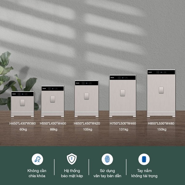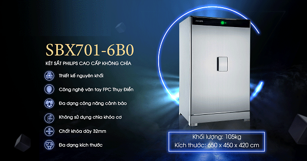 Két sắt điện tử Philips SBX701-6B0 tạo nên đột phá tiên phong trên thị trường hiện nay với việc loại bỏ hoàn toàn chìa cơ, mở khóa bằng vân tay và mã số.