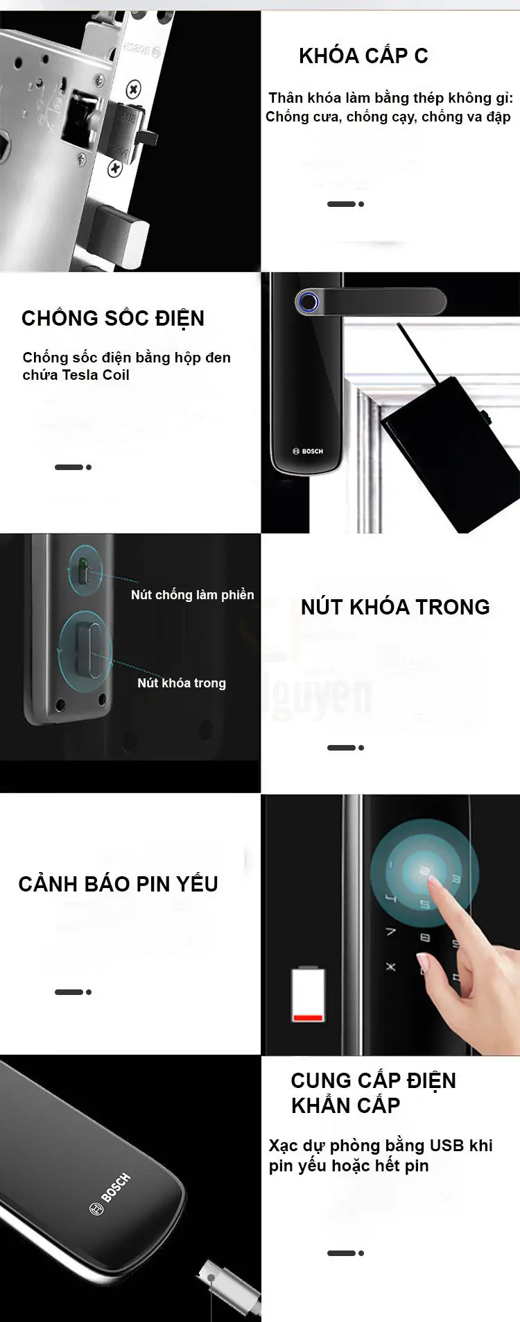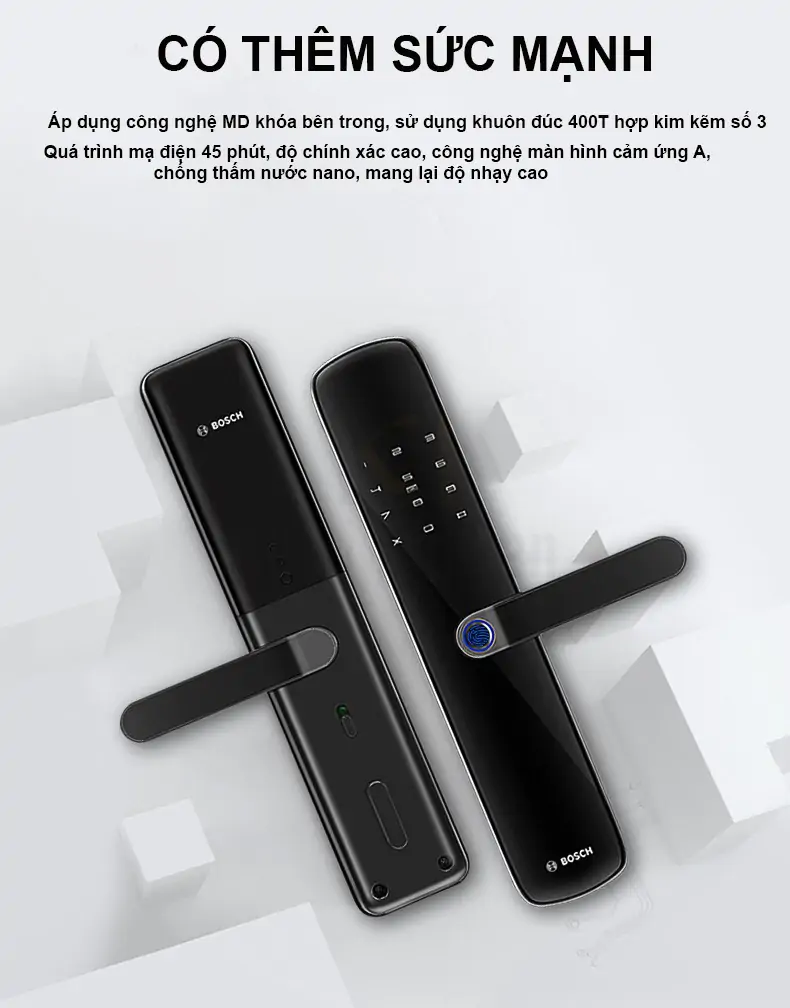 Khóa cửa điện tử Bosch ID60 là mẫu khóa thông minh, được sản xuất từ hợp kim kẽm chống han gỉ với thân khóa chống cắt, phá. Bosch ID60 vận hành bằng 4 phương thức: vân tay sinh trắc, mã số, thẻ từ và chìa cơ. Kèm theo đó là các công nghệ bảo mật: mã số ảo, tổ hợp bảo mật kép, chống sốc điện hiện đại bậc nhất hiện nay. Trước khi đi vào sản xuất đại trà, khóa phải trải qua những bài test độ bền cực kì khắc nghiệt. Đảm bảo tuổi thọ bền bỉ với thời gian.