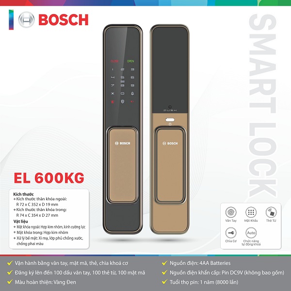 - Khóa vân tay Bosch EL 600 màu đồng có thể lắp đặt được cho chung cư, hộ gia đình, Penhouse,.... sang trọng và đẳng cấp không thua kém bất cứ dòng khóa nào trên thị trường.