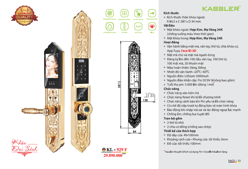 + Vận hành bằng mật mã, vân tay, thẻ từ, chìa khóa cơ, App Tuya, Face ID 3D
