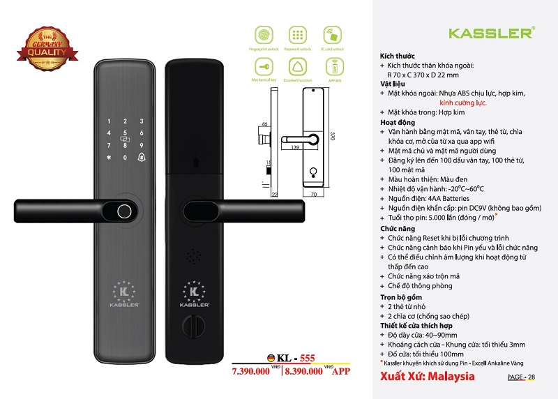 Thông số kỹ thuật khóa cửa vân tay Kassler KL-555