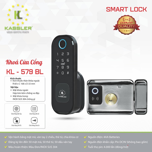 Khóa Cửa Vân Tay Kassler KL-579 BL là loại khóa vân tay dành riêng cho cửa cổng thế hệ mới, tích hợp phương thức bảo mật cao phù hợp lắp khóa cửa trọ để kinh doanh thì đây là thiết bị bảo mật thông minh giúp bạn quản lý dễ dàng và tiện lợi.