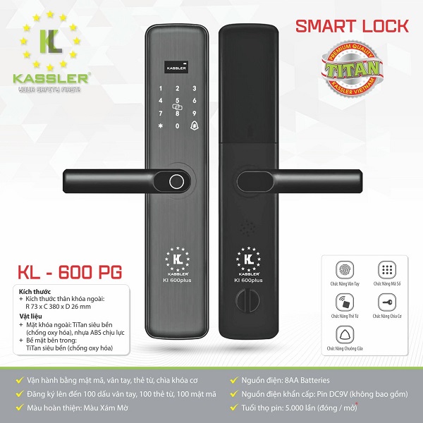 Khóa cửa vân tay Kassler KL-600 đăng ký lên đến 100 dấu vân tay, 100 thẻ từ, 30 mật mã
