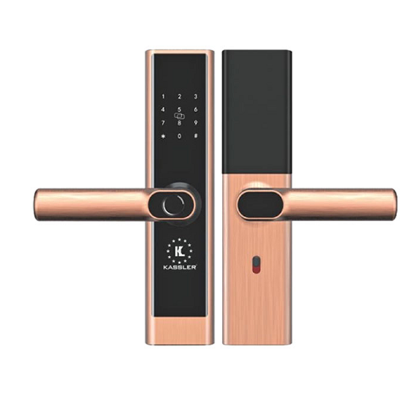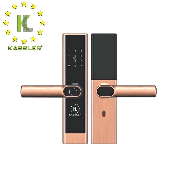 Khóa Cửa Vân Tay Kassler KL-656 COPPER có thiết kế nhỏ gọn, thông minh hiện đại với tính năng mở cửa vân tay, mã số, thẻ từ tiện lợi, kết hợp mở rộng mở từ xa bằng App wifi.