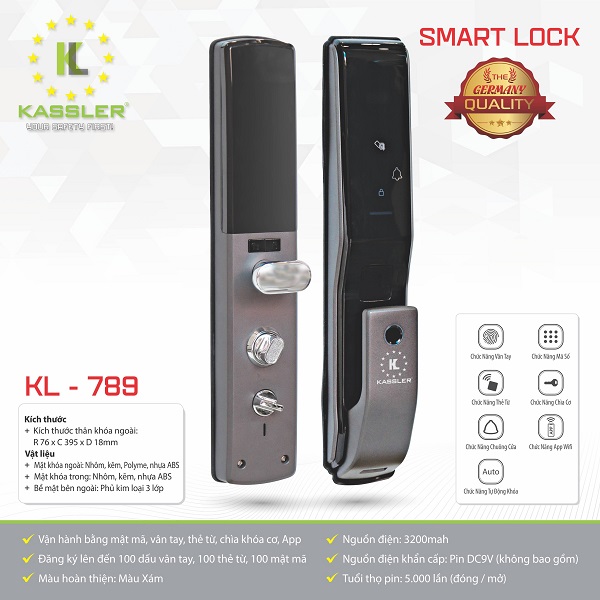 Khóa cửa vân tay Kassler KL-789 App vận hành 5 phương thức mở khóa cùng 1 sản phẩm: Vân tay, mật mã, thẻ từ, chìa khóa cơ chống sao chép, App wifi. Kèm theo 2 thẻ từ và 2 chìa cơ duy nhất chống sao chép có thể mở cửa, không có chiếc thứ 3 có thể mở Khóa Vân Tay Kassler KL-789 APP.