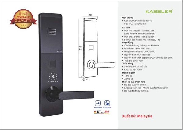 Thông số kỹ thuật Khóa cửa điện tử Kassler KL-393