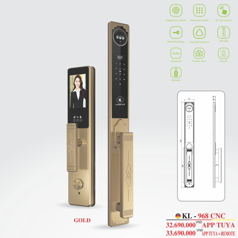Khóa vân tay KL-968 CNC là sự kết hợp hoàn hảo giữa 2 thiết bị khóa cửa điện tử và FACE ID, đàm thoại 2 chiều. Khi sở hữu Kassler KL-968 CNC GOLD APP bạn sẽ không cần tốn kém chi phí mua chuông màn hình nữa. Mời bạn tham khảo 1 số thông tin dưới đây