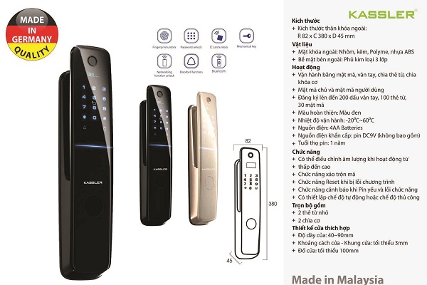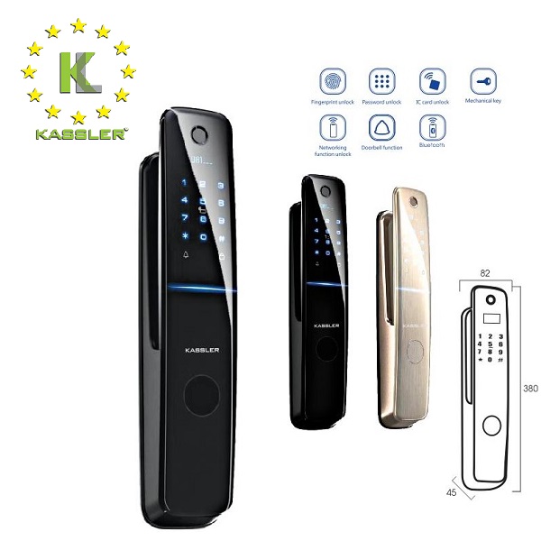 Khóa vân tay Kassler KL-858 là sản phẩm mới của Kassler sản xuất tại Malaysia trong dây truyền hiện đại. Khóa được áp dụng công nghệ mới như bảo mật vân tay, mở khóa bằng app điện thoại, tích hợp chức năng chuông cửa nhằm tối ưu sự tiện lợi cho khách hàng đem lại sự trải nghiệm tốt nhất.
