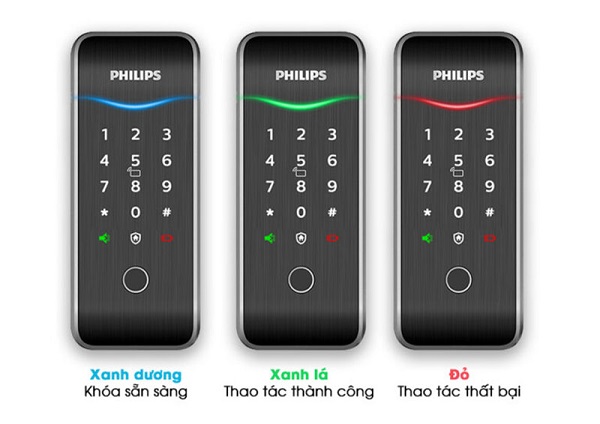 Đèn thông báo – thiết kế độc quyền của Philips 5100 với 3 trạng thái thông báo: màu xanh dương: trạng thái sẵn sàng, màu xanh lá: thao tác thành công, màu đỏ: thao tác thất bại.