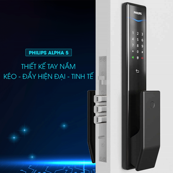 Khóa cửa vân tay Philips Alpha-5 Là mẫu khóa cửa thông minh thuộc dòng push – pull của Philips. Với sự tiện lợi, nhanh chóng bằng khả năng mở khóa tự động, kết hợp với các phương thức bảo mật tiên tiến. Philips Alpha mang đến cho người dùng trải nghiệm mở khóa cực kì ấn tượng.