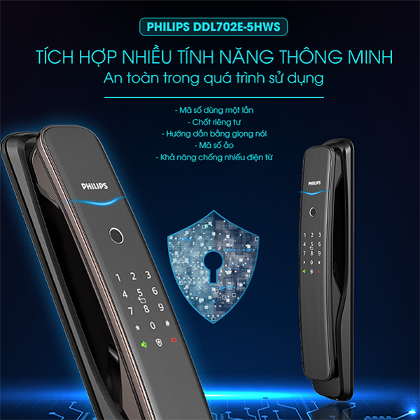 Khóa cửa vân tay Philips DDL702E-5HWS có các chức năng vân tay, thẻ từ, mã số, chìa cơ. Ngoài ra, khóa còn được trang bị các chức năng cao cấp như kết nối wifi, điều khiển từ xa,…Đây là dòng khóa điện tử thông minh, được coi là sự lựa chọn tối ưu giúp cuộc sống của chúng ta trở nên an toàn, tiện lợi.