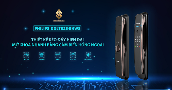 Khóa cửa vân tay Philips DDL702E-5HWS chức năng: 100 Vân tay/ 10 Mã số/ Chìa cơ/ 100 Thẻ từ/ App điện thoại