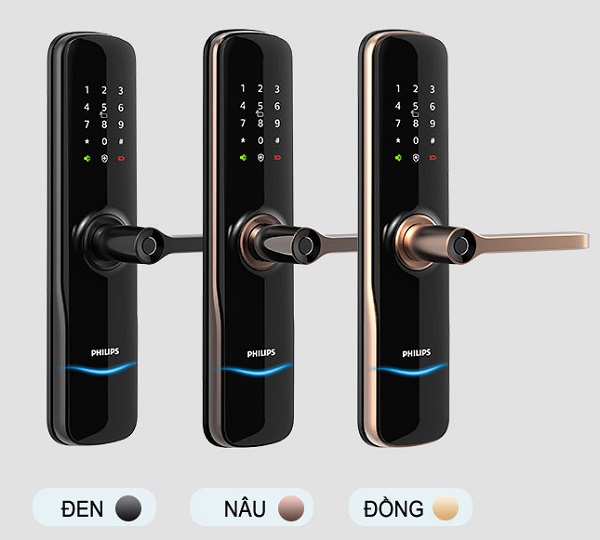 Khóa cửa vân tay Philips PI có 3 lựa chọn về màu sắc Đen, nâu và Đồng đỏ, người dùng sẽ có rất nhiều lựa chọn sao cho phù hợp với gia đình mình.