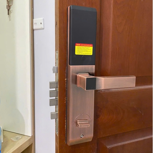 Khóa cửa vân tay thông minh Kawa K609 được thiết kế hiện đại, mặt khóa sử dụng IBM chống xước, và bám bụi, màu sắc chủ đạo mà đen và màu viền đồng, sang trọng. lõi khóa được được từ hợp kim chống cắt phá và luôn có 4 chốt khóa đảm bảo và chống cậy phá cho khóa cửa của bạn