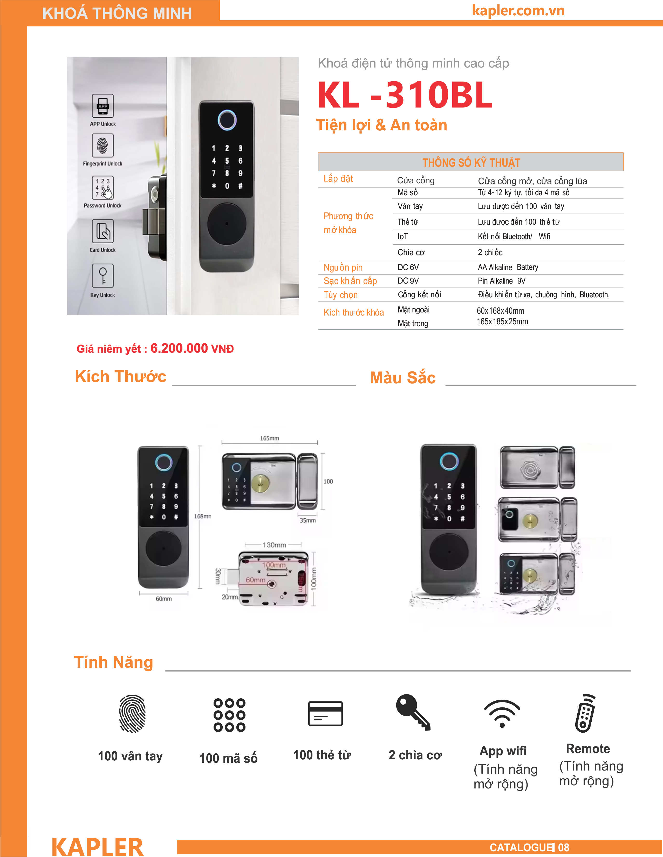 2. Thông Số Kỹ Thuật Khóa Cổng Vân Tay Kapler KL-310BL