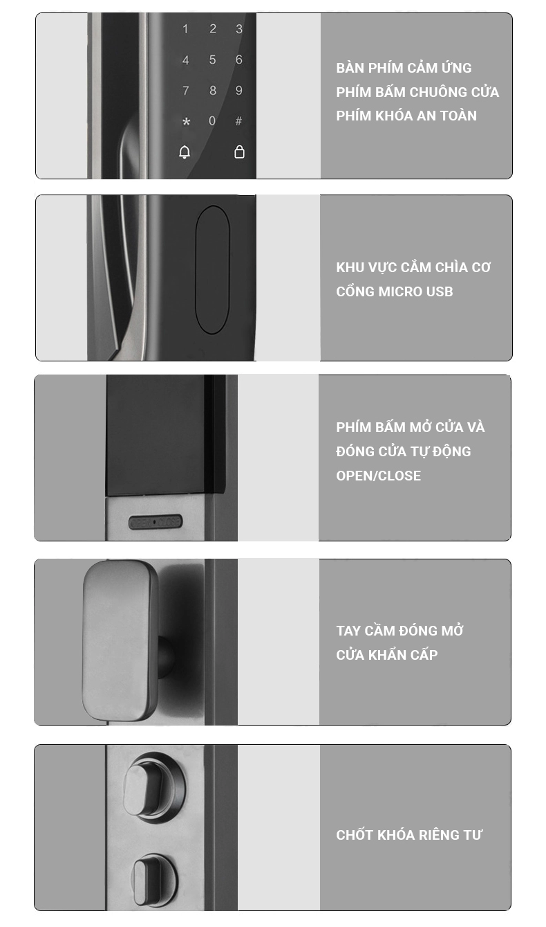 - Kiểu mở khóa : Vân tay + Mật mã + Thẻ từ +Chìa cơ , tùy chọn không App, app Tuya wifi hoặc Zigbee