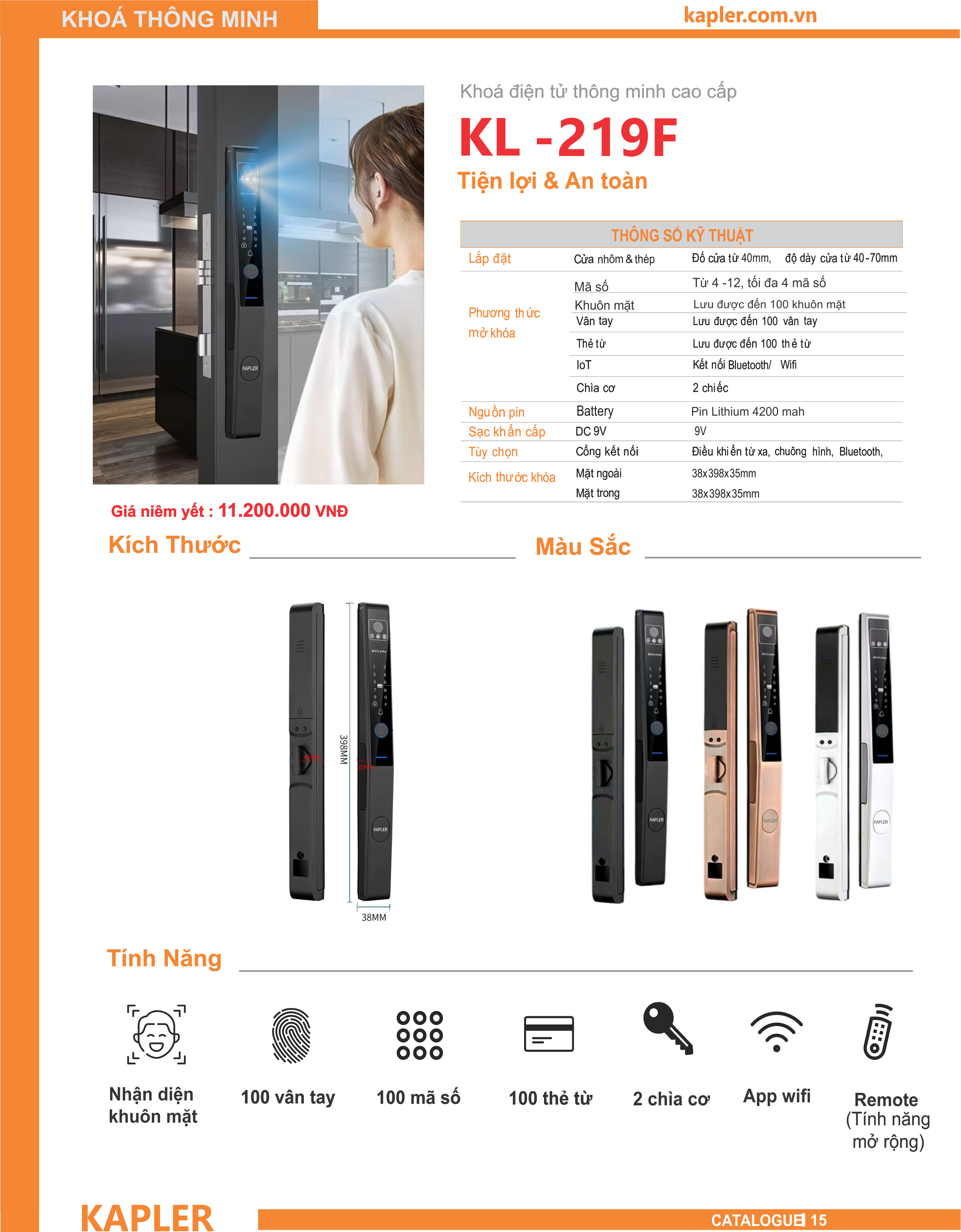 2. Thông Số Kỹ Thuật Khoá Nhận Diện Khuôn Cửa Nhôm Kapler KL-219F