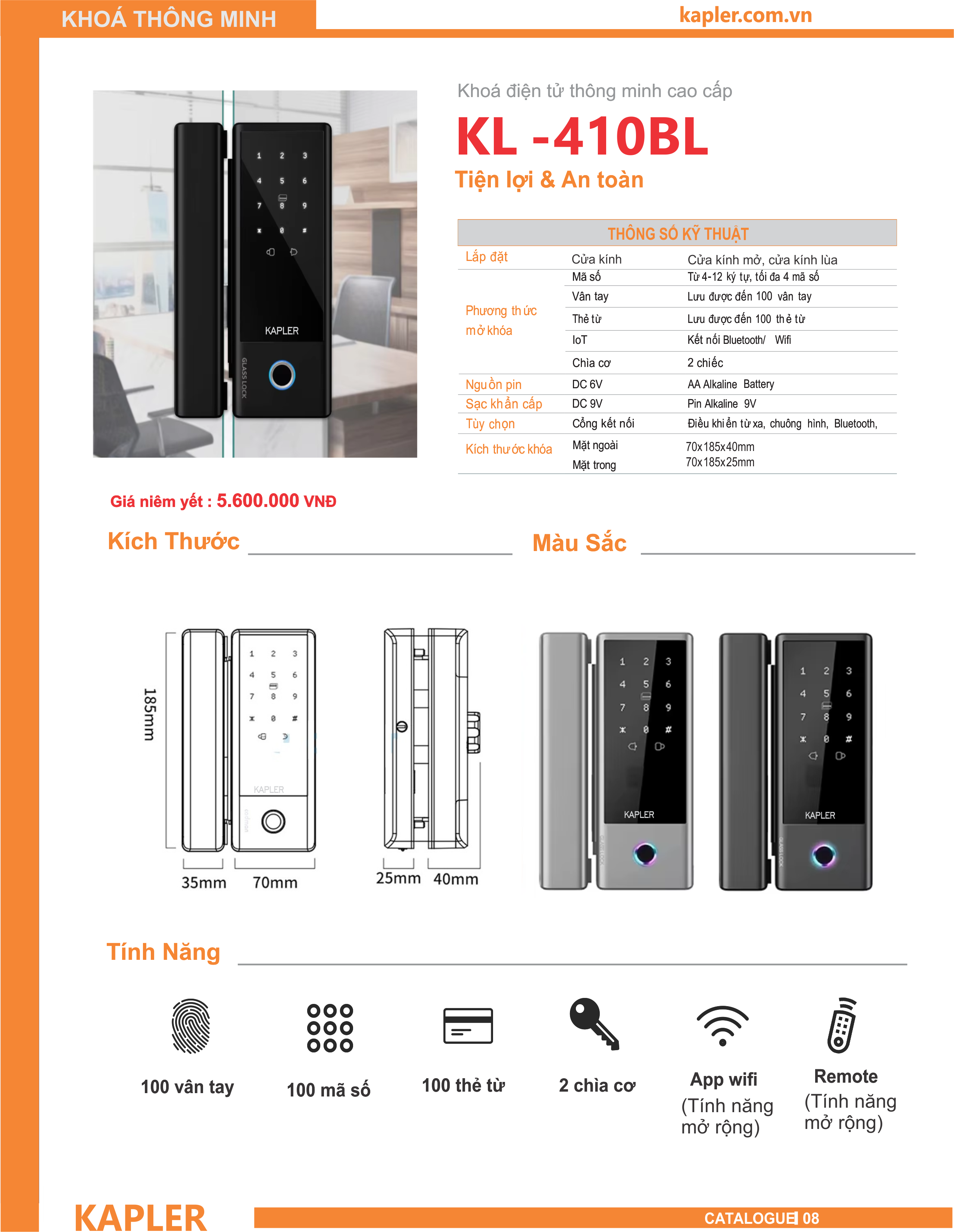 2. Thông Số Kỹ Thuật Khóa Vân Tay Cửa Kính Kapler KL-410BL