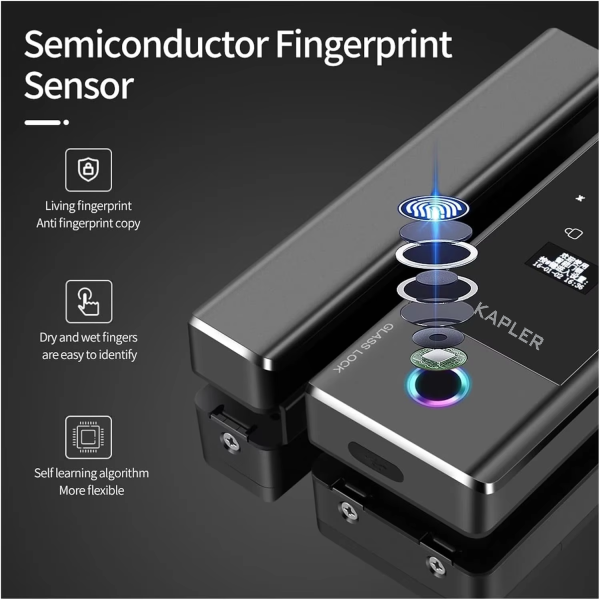 Khóa vân tay cửa kính Kapler KL-410BL được rất nhiều khách hàng lựa chọn, với tính năng mở cửa bằng vân tay, mã số, thẻ từ, App Tuya, 2 Remote và chìa cơ vô cùng tiện lợi cho văn phòng, cửa hàng, nhà riêng, được thiết kế và chế tạo tỉ mỉ, chính xác từng chi tiết, thời gian mở khóa chỉ <0.2s