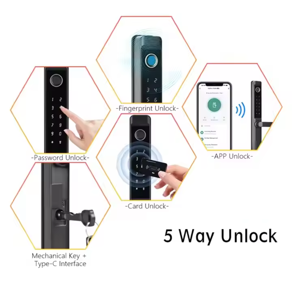 Vận hành 5 chức năng phong phú: Mở khóa bằng vân tay vân tay FPC thụy điển, mở khóa bằng mật mã cho phép cài đặt mã số ảo chống nhìn trộm, Mở khóa bằng thẻ từ IC, mở khoá bằng App Bluetooth, chìa khóa Vật Lý chìa khóa chống sao chép.