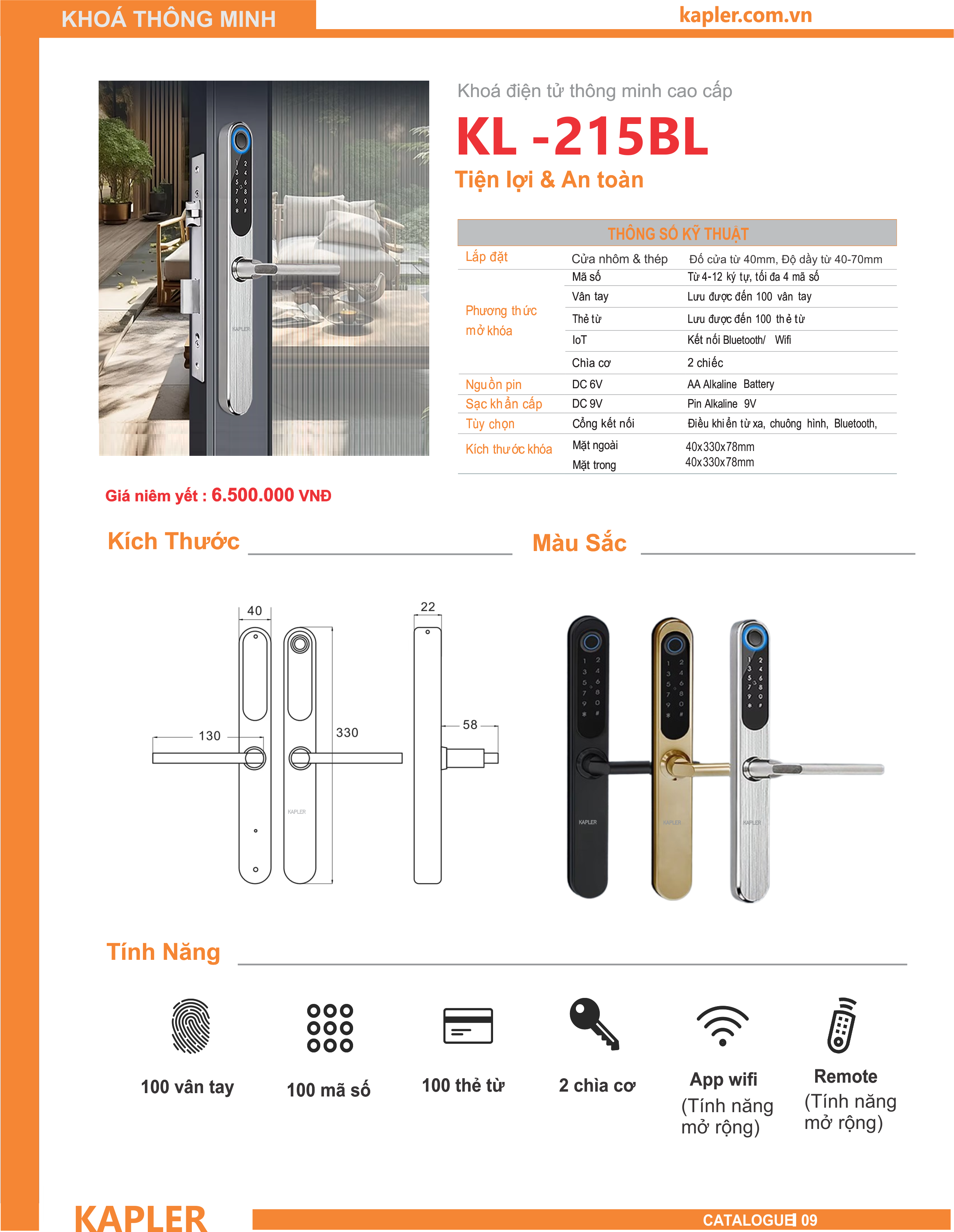 Khóa vân tay cửa nhôm Kapler KL-215BL là mẫu khóa cửa thông minh thế hệ mới. Thiết kế mạnh mẽ bền bỉ. Khóa còn được trang bị các tính năng thông minh bảo mật nhất hiện nay. Như công nghệ vân tay FPC bảo mật nhất hiện nay của Thụy Điển.