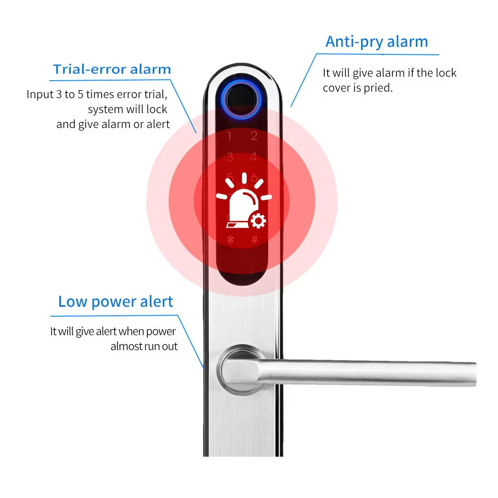 Báo động khi có ngươi đột nhập, cậy phá khoá: Cảnh báo khi bấm sai 5 lần, Cảnh báo khi có dấu hiệu phá cửa, cạy cửa, phá khóa, đập khóa, khoan cắt khóa,… âm thanh cảnh báo sẽ lập tức vang lên nhờ cảm biến được tích hợp trong thân khóa.