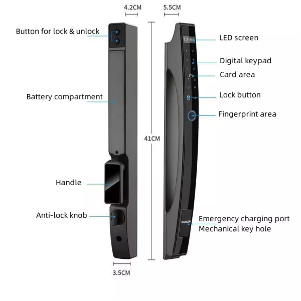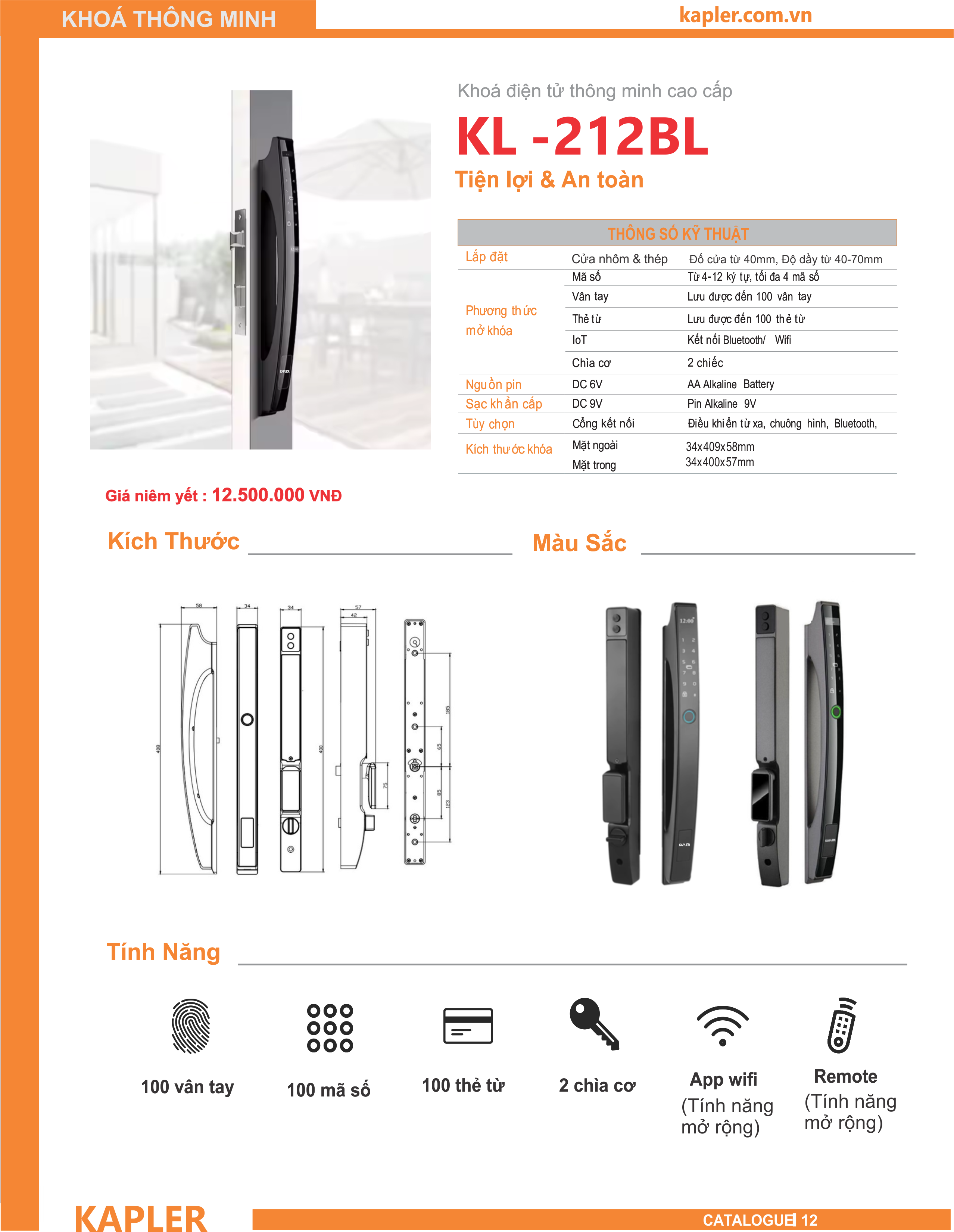 2. Thông Số Kỹ Thuật Khóa Vân Tay Cửa Nhôm Kapler KL-212BL
