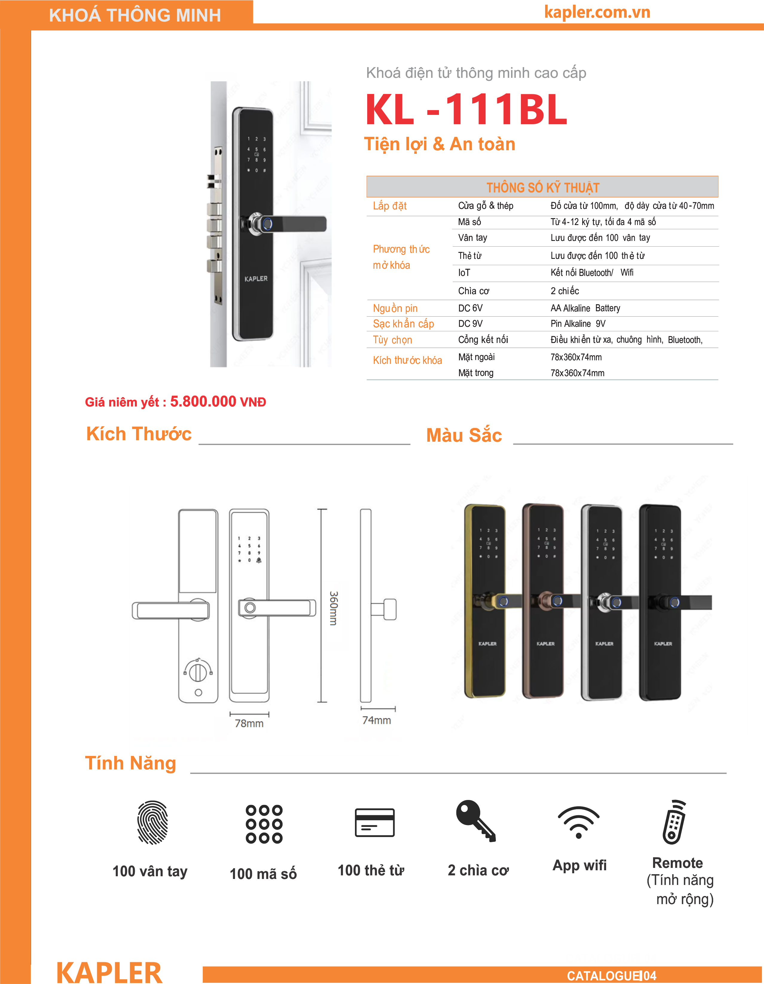 2. Thông Số Kỹ Thuật Khóa Cửa Vân Tay Kapler KL-111BL
