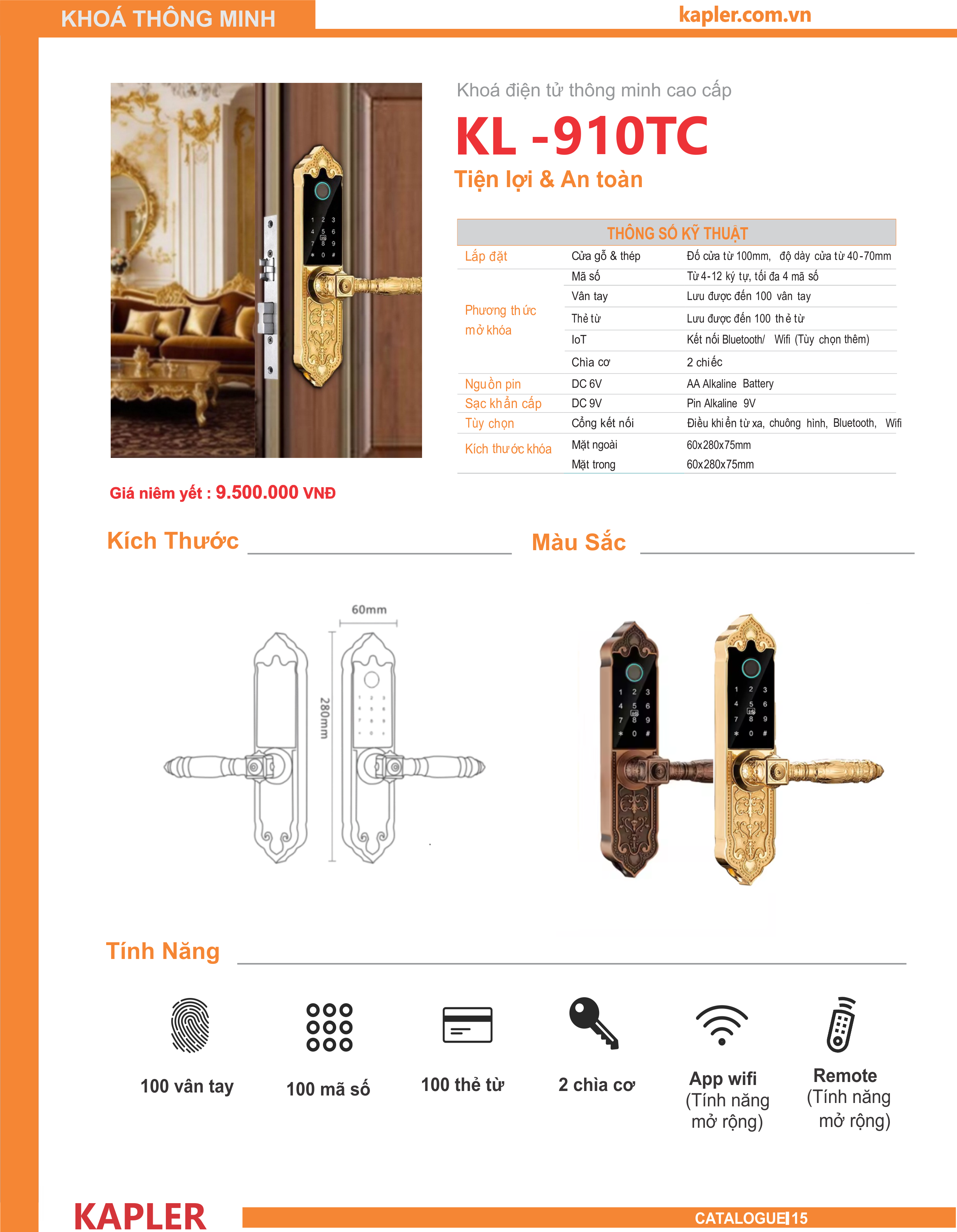 2. Thông Số Kỹ Thuật Khóa Cửa Vân Tay Tân Cổ Điển Kapler KL-910TC