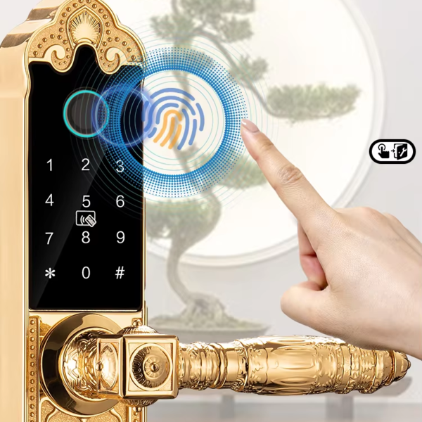 Với chất liệu chủ đạo là hợp kim cao cấp không gỉ, bề ngoài phủ vàng 24k cao cấp giúp khóa vân tay KL-910TC tỏa sáng với bề mặt bóng mượt, mang đến sự sang trọng và lâu bền cho ngôi nhà. Thiết kế chi tiết các hoa văn trên khóa được chế tác tỉ mỉ trong từng hoa văn đã tạo ra một tác phẩm nghệ thuật thực sự.