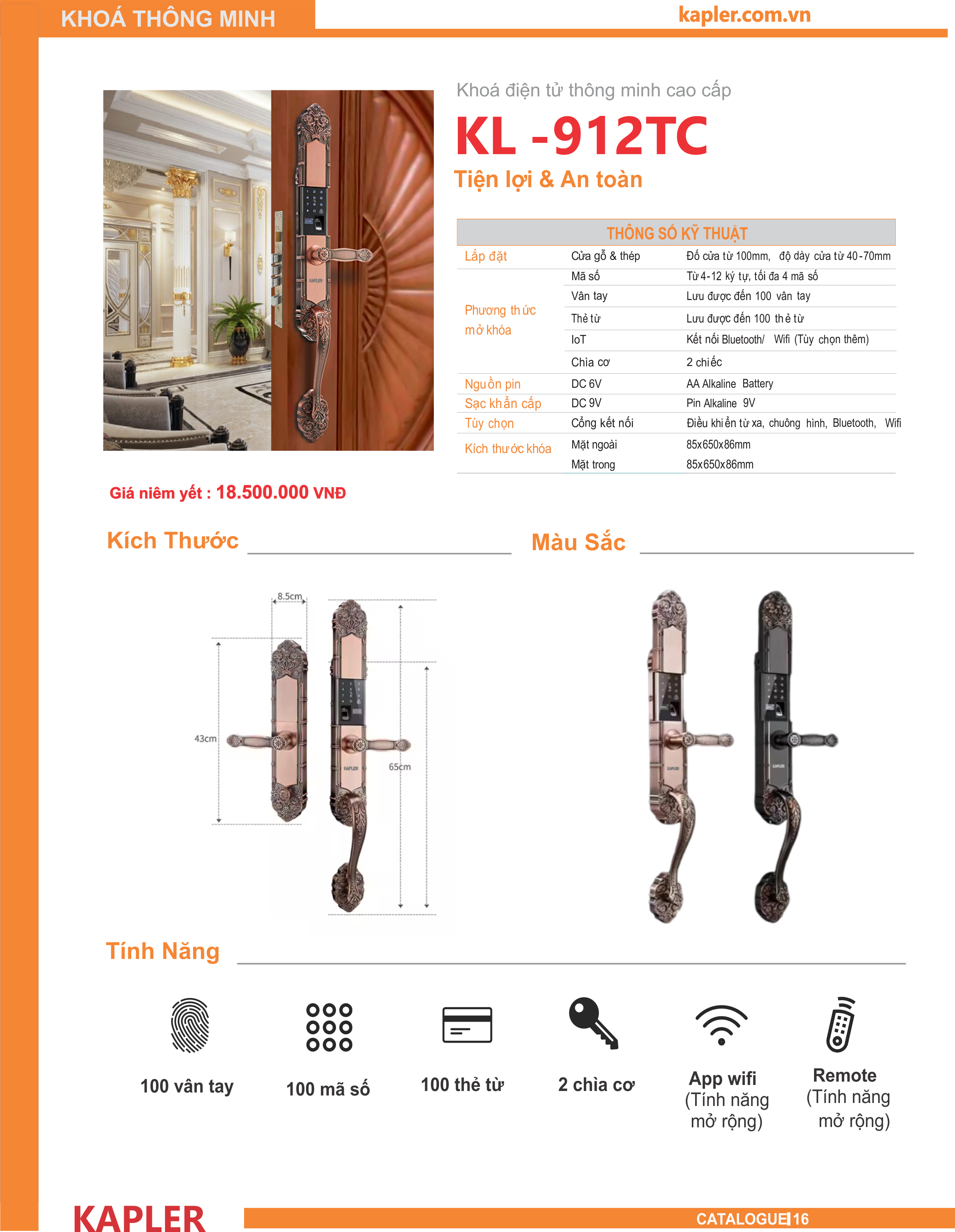 2. Thông Số Kỹ Thuật Khóa Cửa Vân Tay Tân Cổ Điển Kapler KL-912TC