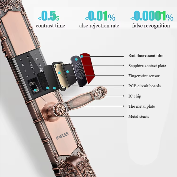 Khóa cửa vân tay tân cổ điển Kapler KL-912TC với chất liệu hợp kim mạ đồng cao cấp, mang đến tính thẩm mỹ sang trọng cho ngôi nhà bạn, tính năng bảo mật cao mở khóa bằng vân tay, mật mã, thẻ từ. Ngoài ra Khóa vân tay Kapler KL-912TC còn được nhà sản xuẩt tích hợp tính năng kết nối Bluetooth mở khóa bằng app điện thoại, một tính năng hoàn toàn mới áp dụng trên các dòng sản phẩm khóa vân tay cao cấp.