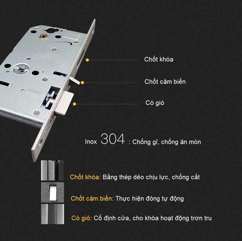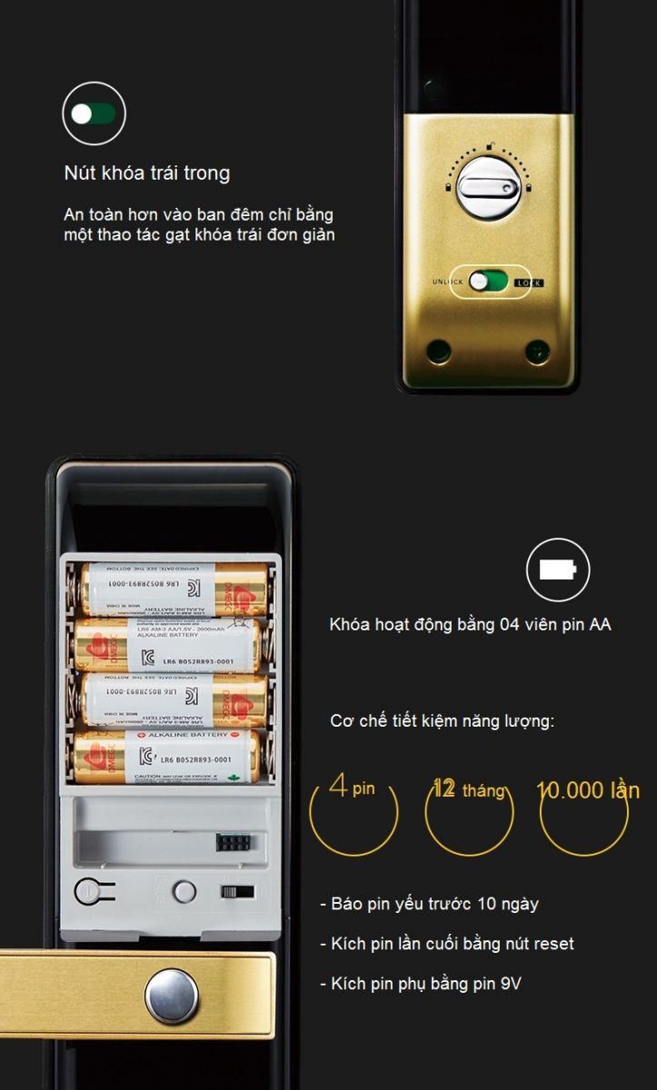 | Kiểu mở khóa | Thẻ từ, mật mã, Chìa cơ, Điều khiển từ xa(mở rộng) |