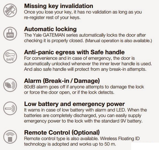 - Mở khóa bằng mã số, thẻ RF, chìa cơ và mở rộng remote
