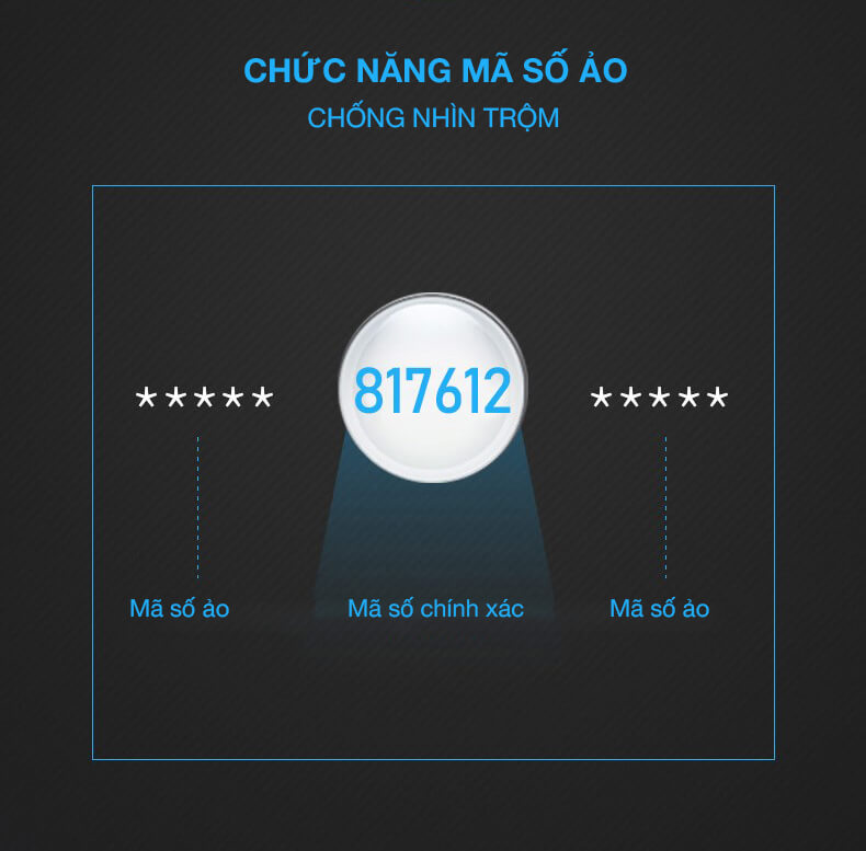 Người dùng lo lắng về việc đặt mã số đơn giản thì dễ ghi nhớ nhưng cũng bảo mật không cao do có thể sơ hở bị nhìn trộm. Nhưng khóa vân tay Kaadas 6002 đã xóa bỏ được nhược điểm này với chức năng mã số ảo. Người dùng có thể thêm phía trước hoặc sau mã số chính xác một đoạn mã số ảo bất kỳ. Điều này khiến cho việc mở khóa bằng mã số trở nên an toàn hơn.
