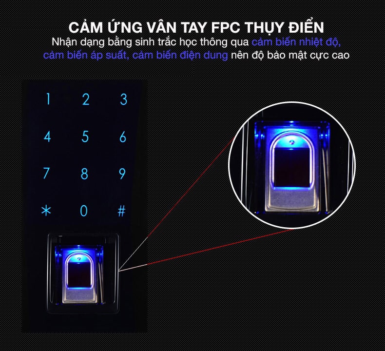 FPC là công nghệ vân tay hiện đại nhất trong thị trường khóa cửa hiện nay. Nhà sản xuất thiết kế nhận dạng dựa trên cảm biến nhiệt độ, điện dung và áp suất. Tỷ lệ nhận dạng vân tay giả chưa tới 0.001%. Con số này nói lên rằng việc làm giả vân tay là gần như không thể.