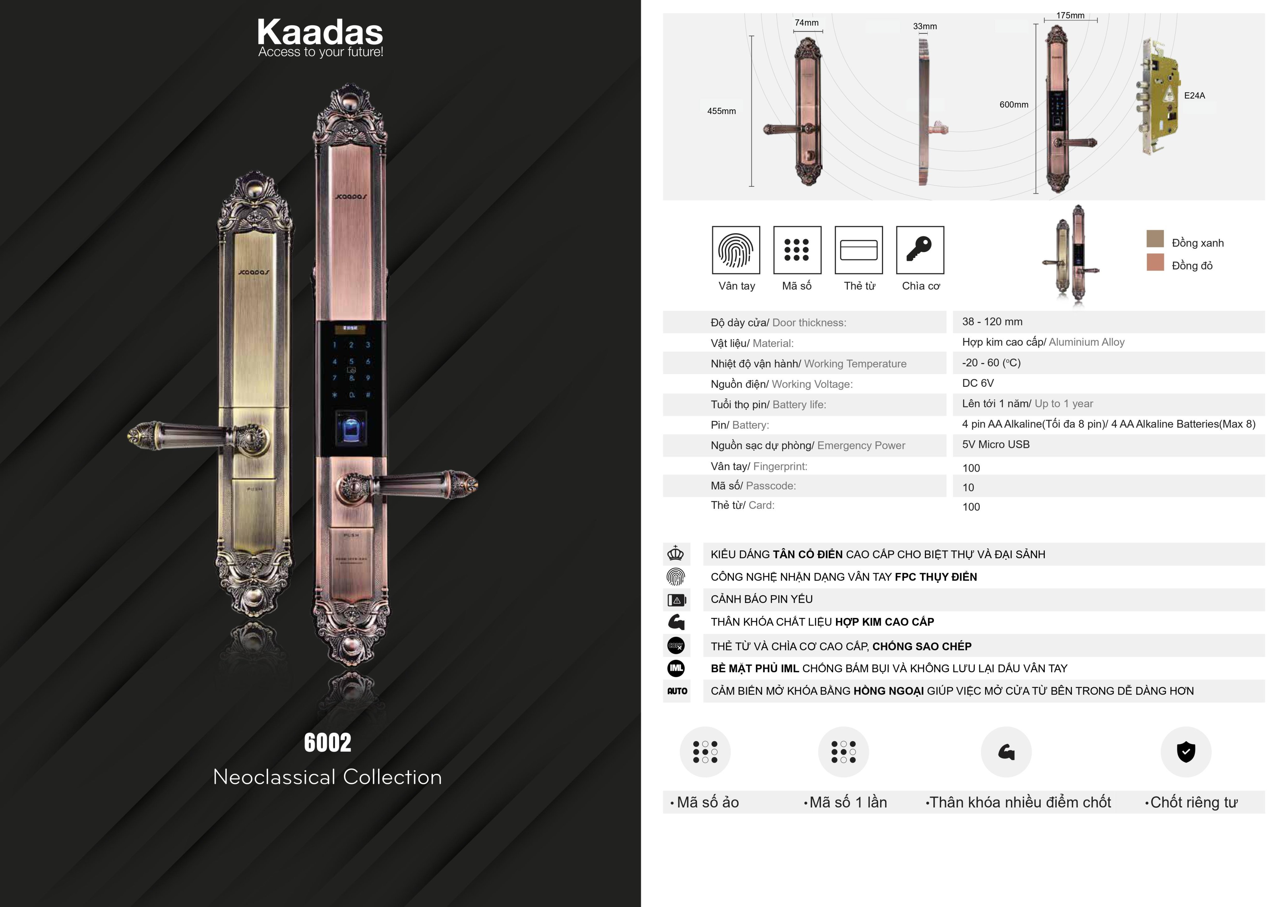 Bộ khoá cửa là một trong những điểm nhấn giúp tô điểm thêm vẻ đẹp hoàn mỹ cho cánh cửa nhà bạn. Với thiết kế tân cổ điển sang trọng cùng nhiều chức năng tiện ích, khóa vân tay kaadas 6002 chính là sự lựa chọn dành cho ngôi nhà của bạn.