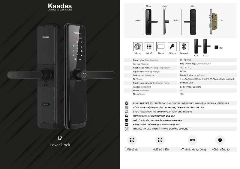- Điểm nổi bật nhất của Khóa cửa vân tay Kaadas L7-5 so với các hãng khóa khác trên thị trường là: