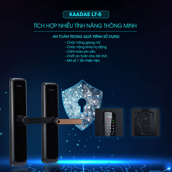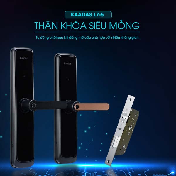 - Khóa cửa vân tay Kaadas L7-5 là mẫu khóa ở phân khúc bình dân. Khóa có đầy đủ tính năng mở như. Vân tay, mật mã, thẻ từ, smart phone và chìa cơ dự phòng.