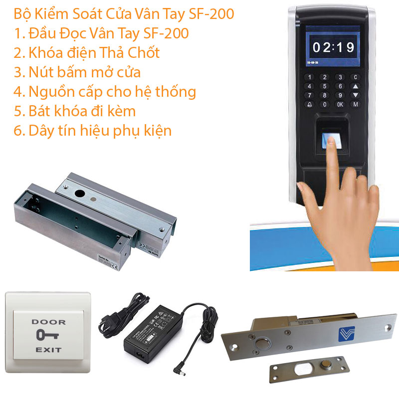 Máy chấm công Ronald Jack SF200 có chức năng xác nhận truy cập từ người dùng (vân tay, mã số), sau đó gửi tín hiệu đến khóa chốt. Nếu xác nhận đúng người dùng thì sẽ cho tín hiệu mở khóa, ngược lại không đúng người dùng sẽ thông báo bằng đèn đỏ và không mở khóa cửa.Nút exit đặt bên trong phòng có chức năng như chiếc cầu dao ngắt điện để mở khóa cửa.