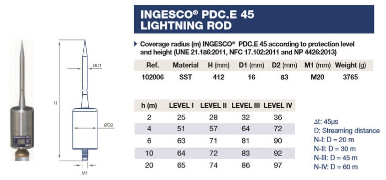 Thông số kỹ thuật Kim Thu Sét Ingesco PDC E45